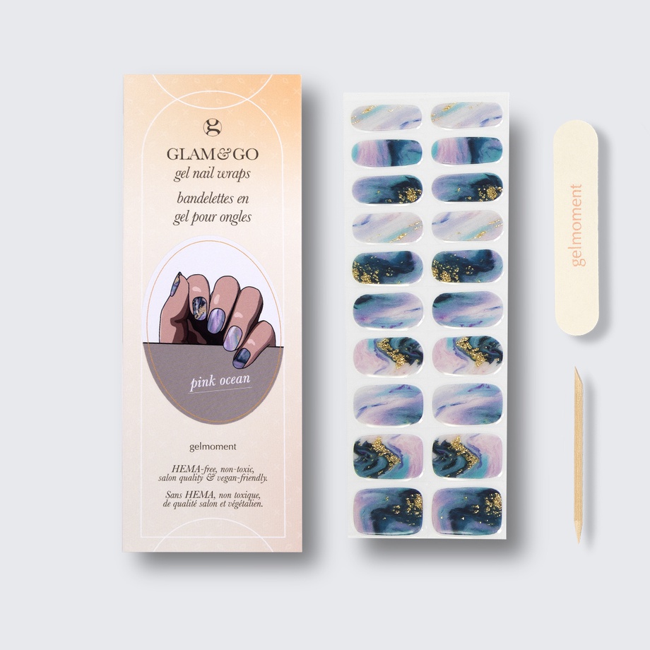 Our GLAM & GO gel nail wraps ensure that no matter how complex your chosen nail design, the application process remains incredibly simple. Our GLAM & GO gel nail wraps require no glue, base coat, or top coat—just peel them off the packaging, apply them to your nail, trim to size, cure twice, and voilà!