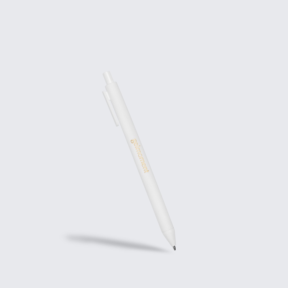 Pack of 4 pens in assorted colours. All monochrome, branded in gold with the Gelmoment logo. Black ink.